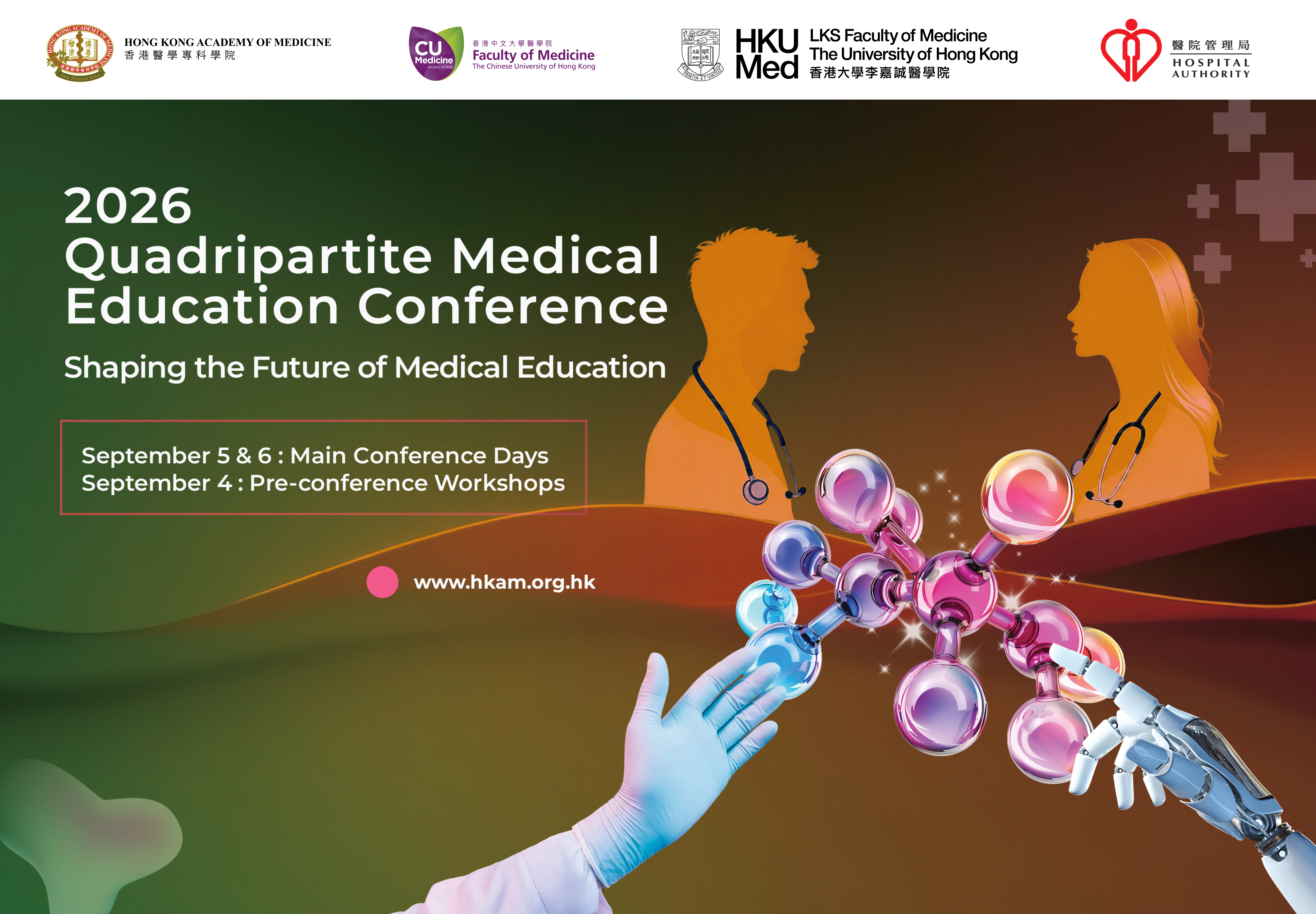 The Hong Kong Academy of Medicine (the Academy) is pleased to announce the Quadripartite Medical Education Conference (QMEC) 2026, to be hosted by the Academy in collaboration with the Faculty of Medicine of The Chinese University of Hong Kong, the Li Ka Shing Faculty of Medicine of The University of Hong Kong, and the Hospital Authority. The Conference will be held at the Hong Kong Academy of Medicine Jockey Club Building, with pre-conference workshops on 4 September, followed by the main Conference on 5 and 6 September 2026.